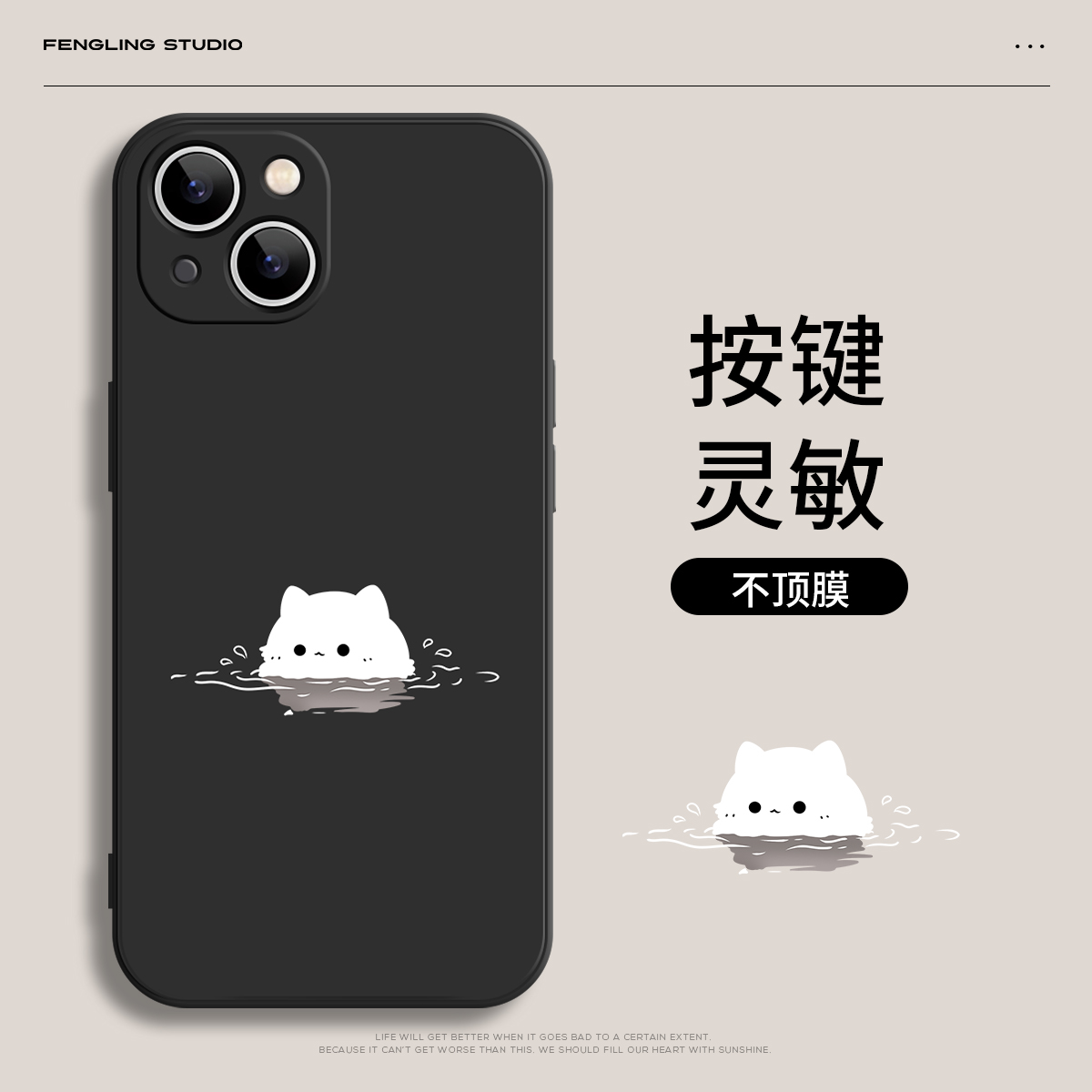 【水中白猫-黑色】直边液态 硅胶软壳