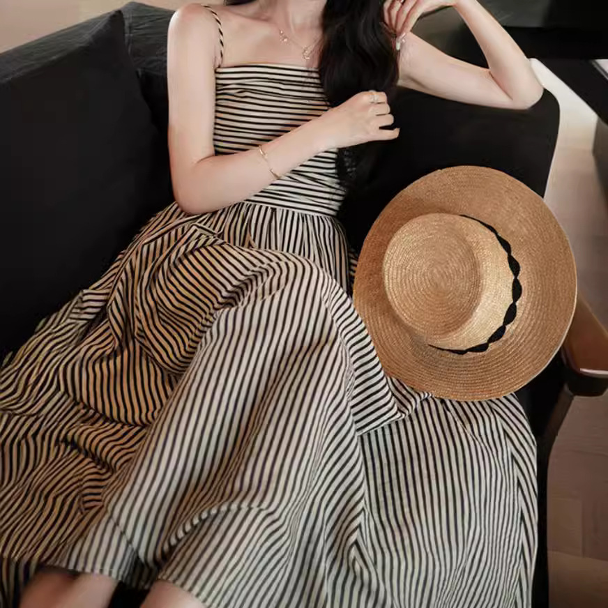 【微醺线条】黑白条纹吊带连衣裙女设计感小众温柔度假泡泡袖长裙