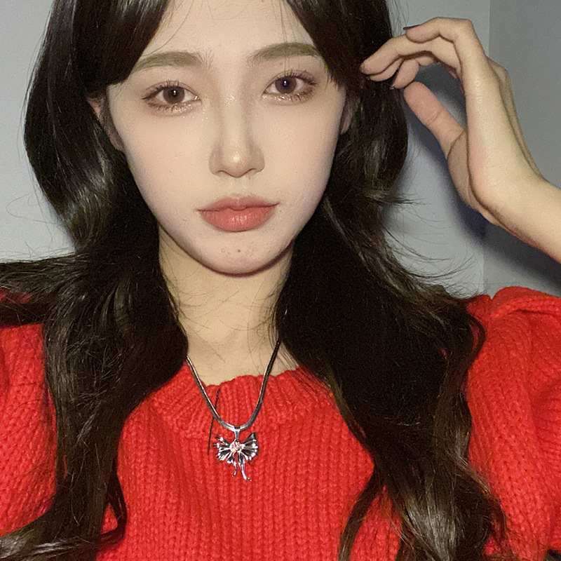小众设计蝴蝶结粉色心形锆石吊坠项链ins冷淡风个性金属网红配饰