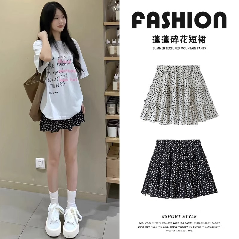 黑色小碎花半身裙女夏季2025新款松紧高腰a字裙小个子蛋糕短裙子
