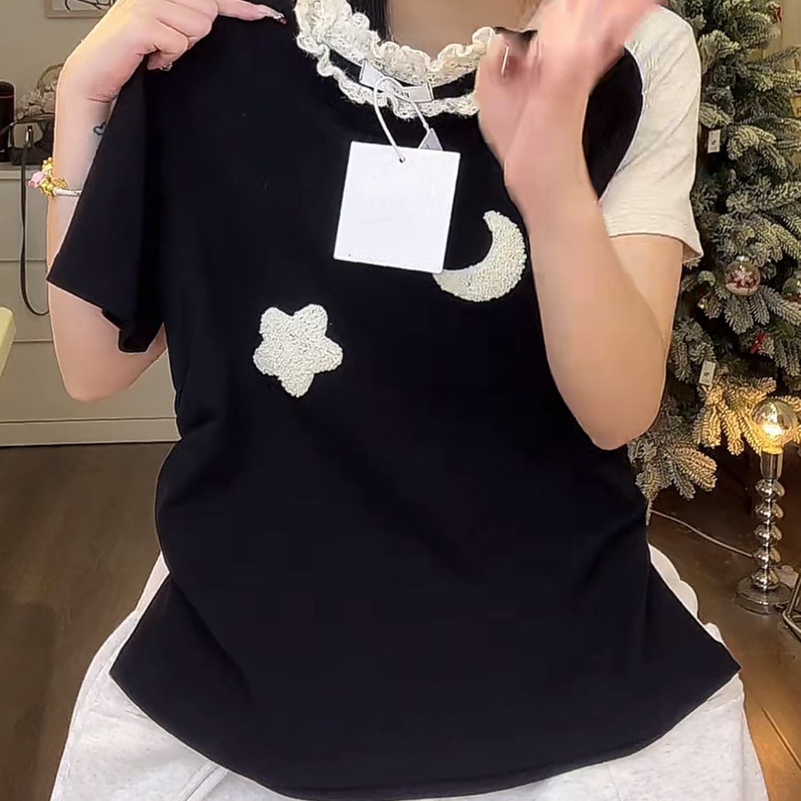 星月刺绣黑色短袖T恤正肩花边蕾丝拼接设计感圆领修身上衣女学生