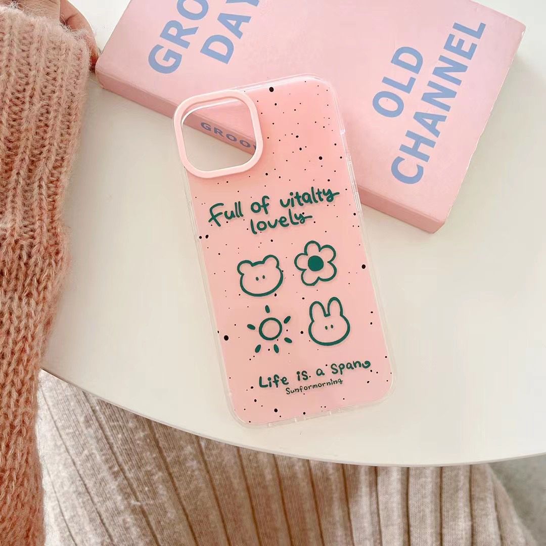 苹果15粉泼墨涂鸦花朵熊兔适用iPhone14ProMax手机壳全包13双层12