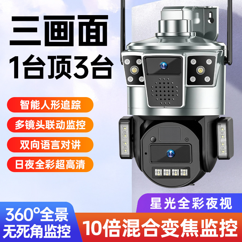 远程无线摄像头监控家用超高清360度室外三画面全彩夜视监控器