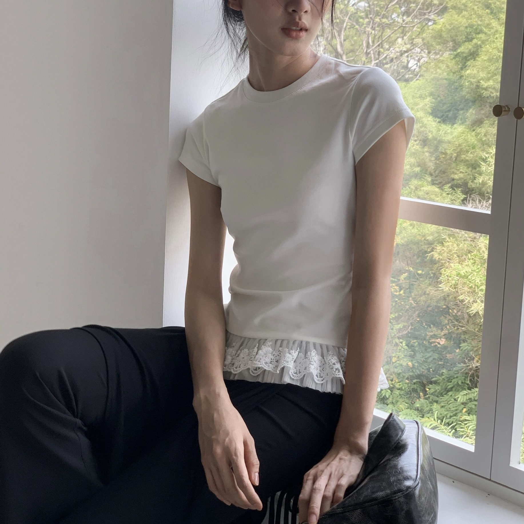 法式蕾丝边白色短袖t恤女夏季新款甜美短款正肩上衣
