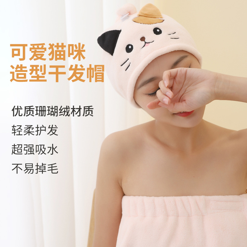 新款ins风卡通萌萌猫可爱干发帽女 珊瑚绒双层加厚吸水速干干发巾