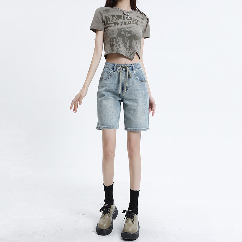 橙娟女装#复古甜酷风弹力牛仔短裤女春夏新款宽松显瘦五分裤