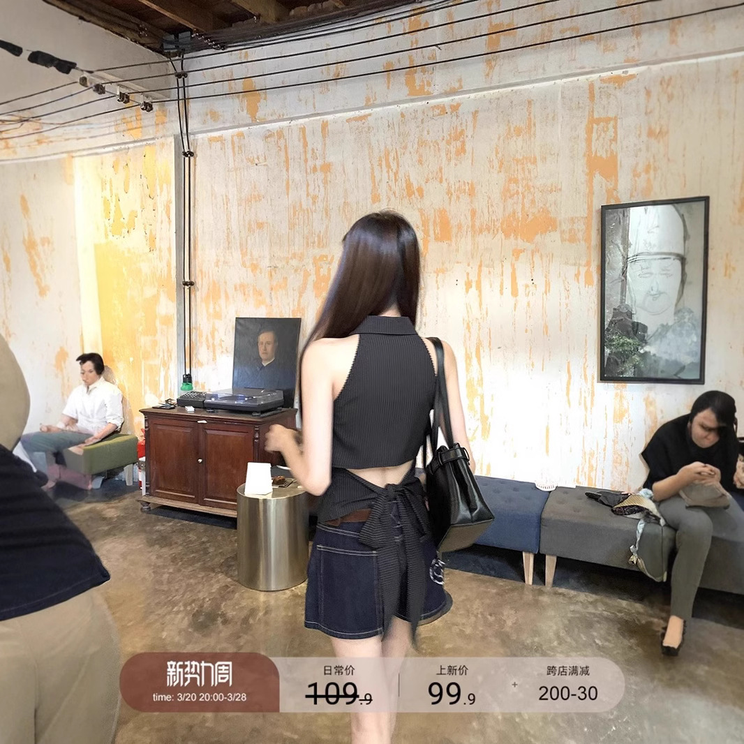 黑色条纹翻领坎肩无袖马甲背心女春夏时尚辣妹露背系带蝴蝶结上衣