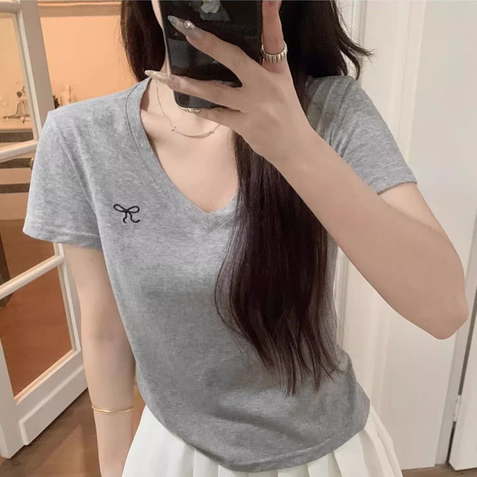 纯白色v领露锁骨短袖t恤女夏季修身显瘦蝴蝶结刺绣别致短款上衣潮