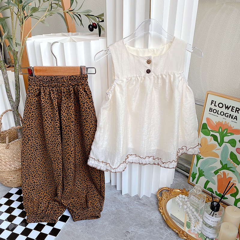 外贸 2025夏装新款小女孩无袖上衣+豹纹防蚊裤两件套女童时尚套装