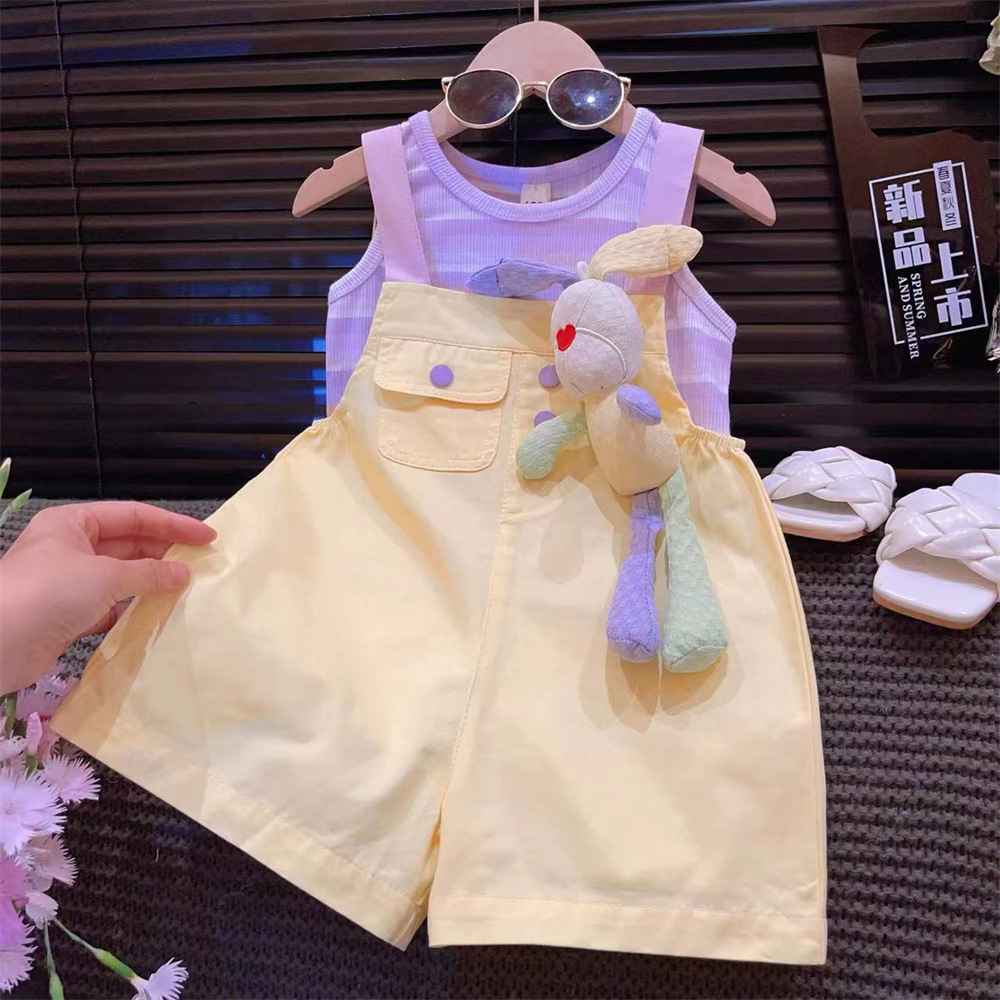 新品女童条纹无袖背心套装2025夏季新款牛仔背带裤中小童两件套