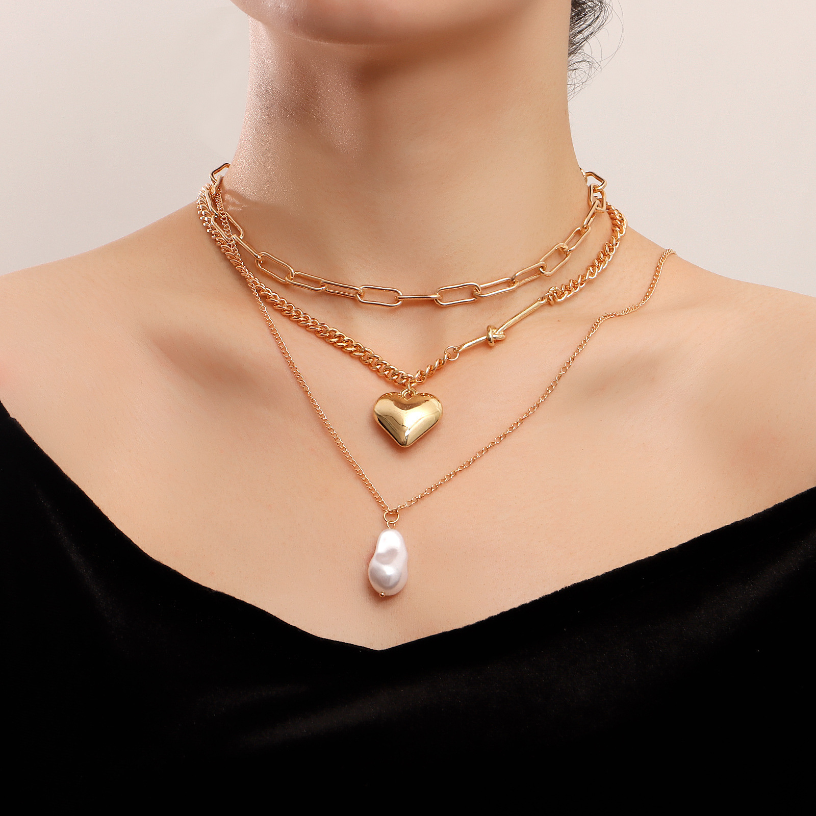 金属风异形珍珠颈链 简约百搭大桃心吊坠项链女