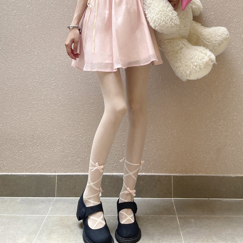 纯欲绑带交叉小腿丝袜白色女手工粉色丝绒蝴蝶结珍珠洛丽塔JK袜子