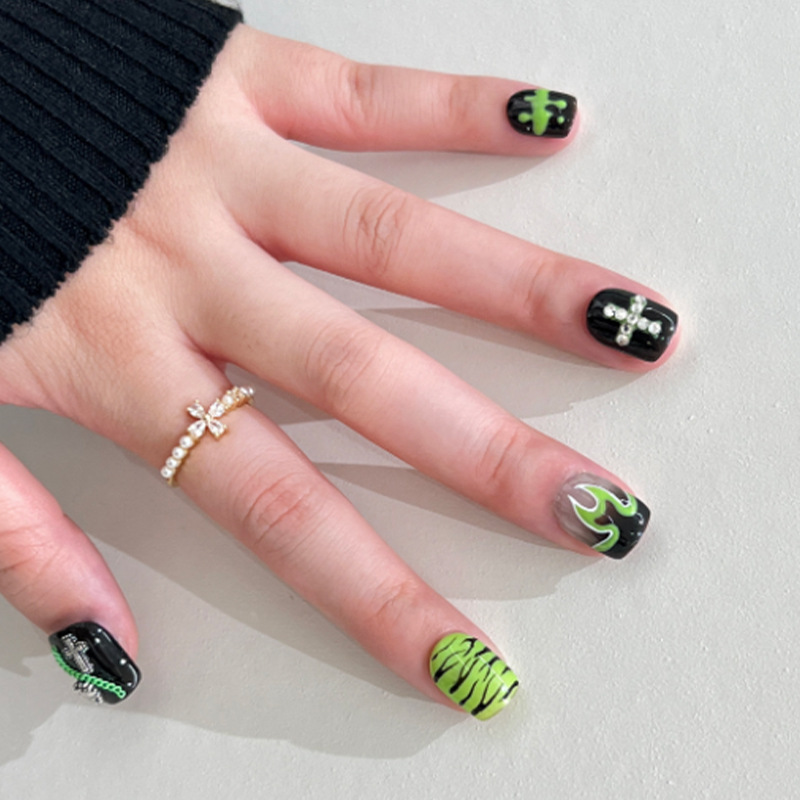 穿戴美甲十字架甜酷黑绿火焰甲片成品链条银色爱心美甲片美甲成品