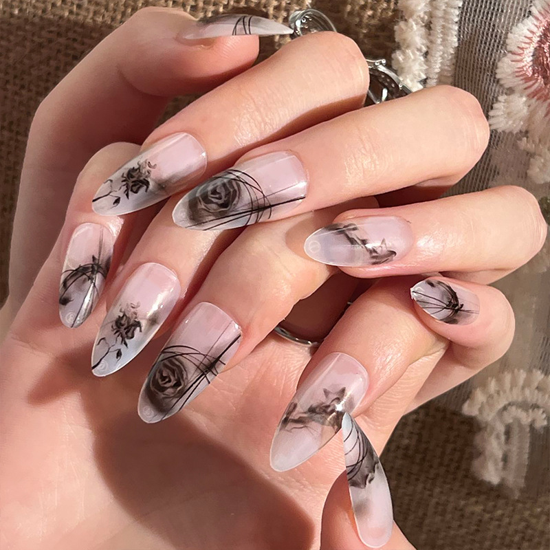 穿戴式美甲黑色玫瑰晕染水彩穿戴甲高级美甲成品指甲贴片