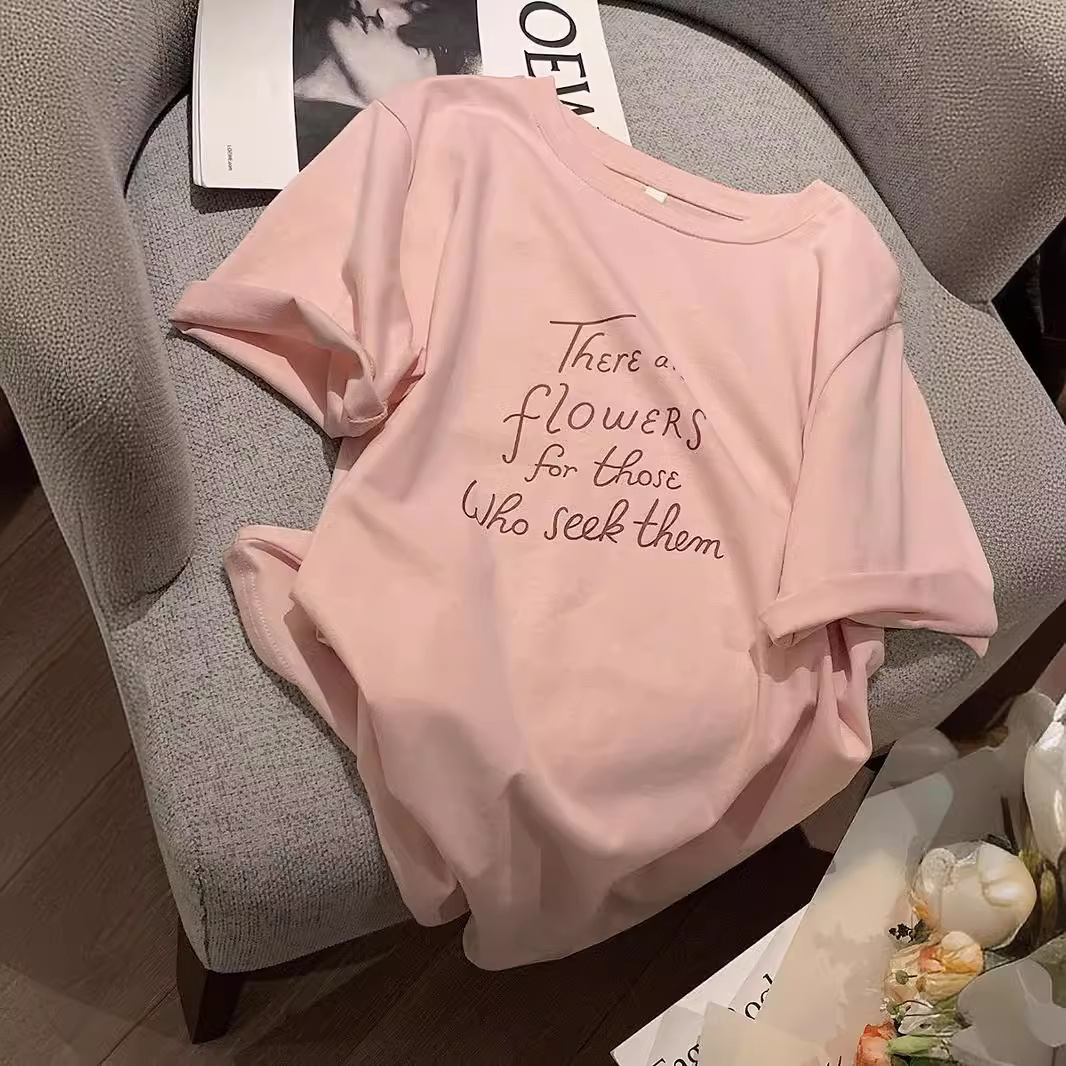 粉色字母印花莫代尔短袖t恤女新款韩版宽松百搭半袖打底上衣