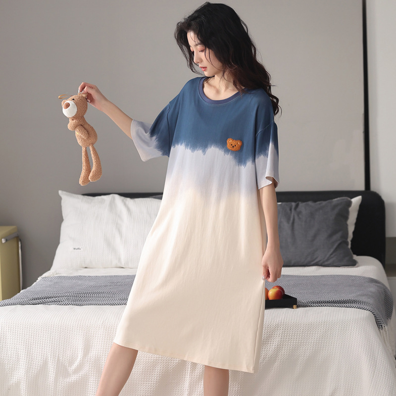 夏季短袖睡裙女纯棉宽松大码薄款韩版渐变色家居服中长款裙子