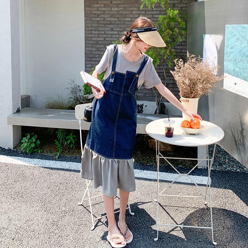 实拍甜酷圆领抽绳收腰显瘦拼接裙摆复古撞色假两件背带牛仔连衣裙