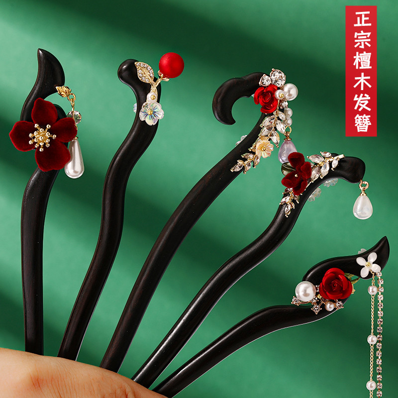 新年红色网红檀木发簪日常盘发簪子