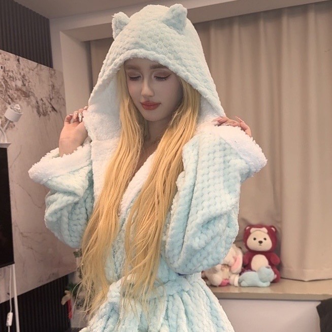浴袍睡袍两用连帽家居服女加绒加厚珊瑚绒睡衣