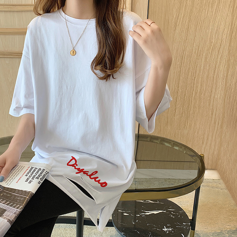 中长款纯棉短袖t恤女宽松新款下摆破洞开叉字母印花半袖上衣