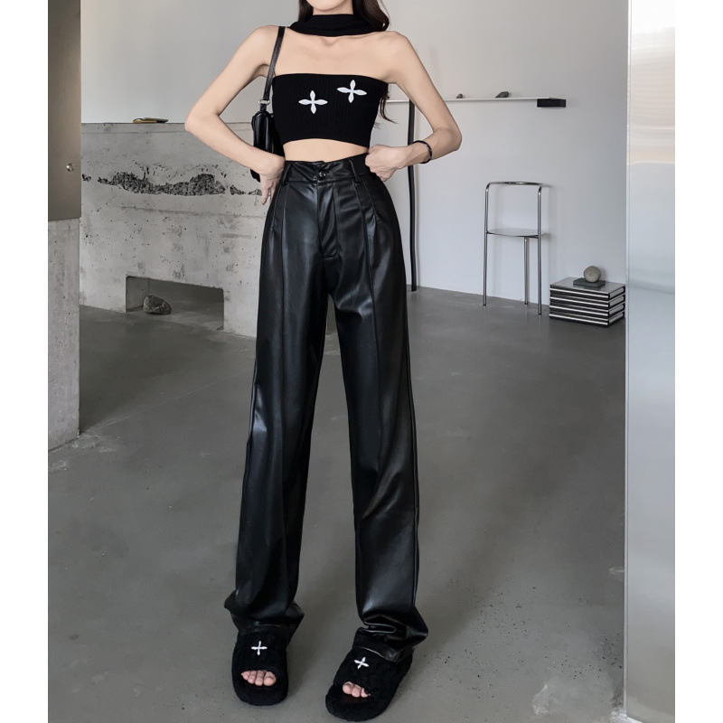 实拍实价现货高腰显瘦紧身黑色皮裤女高级感垂感休闲直筒阔腿长裤