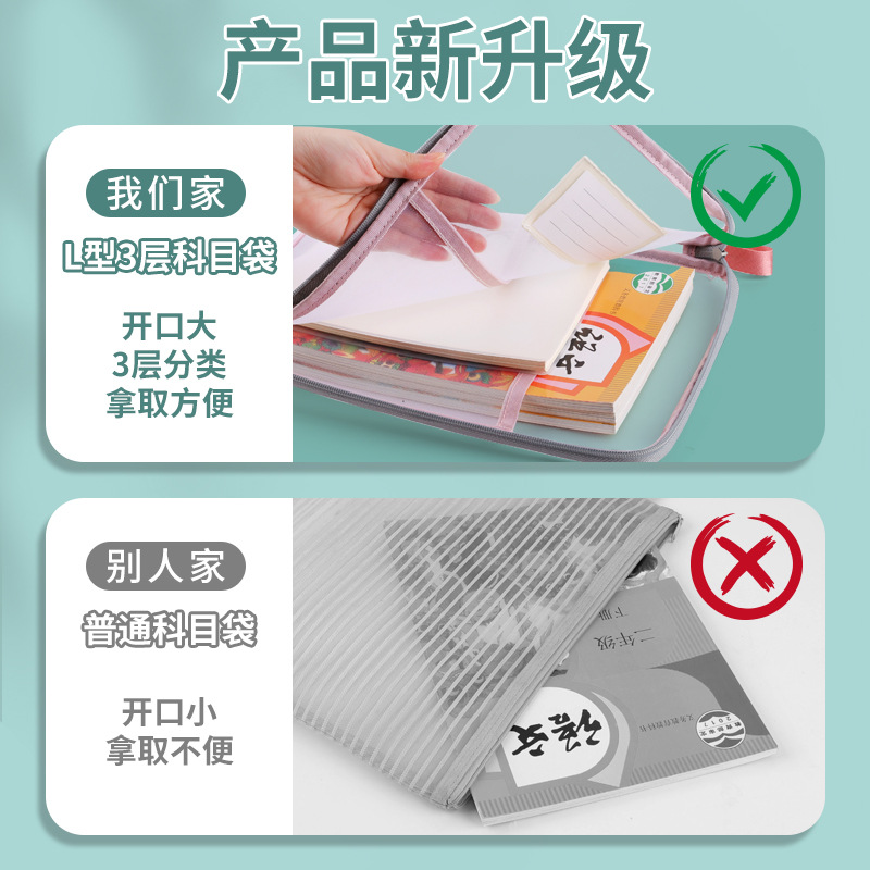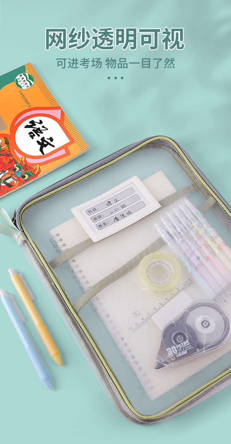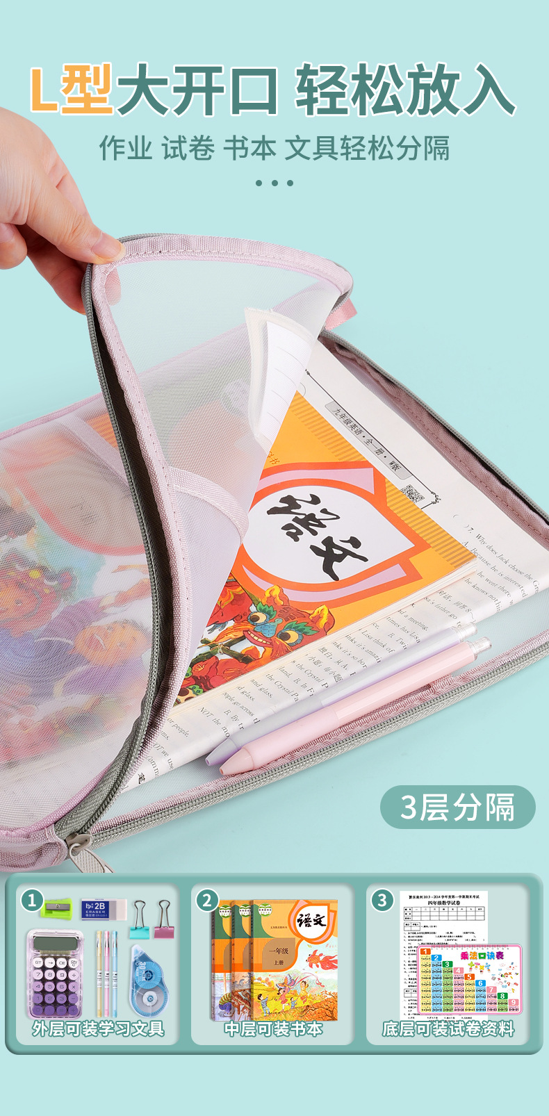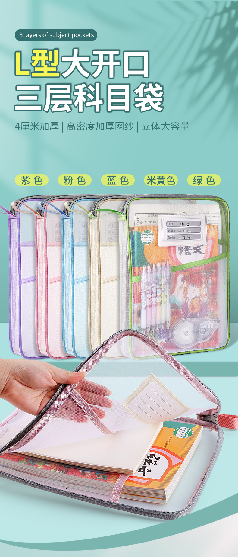 加厚L型文件袋拉链大容量学生手提试卷分类袋 网纱三层科目袋