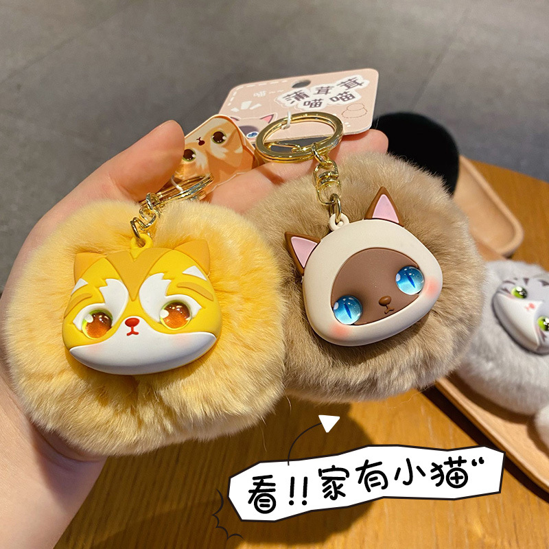 卡通蒲茸茸喵喵汽车钥匙扣毛绒猫咪车用挂饰创意毛球精致车载挂件