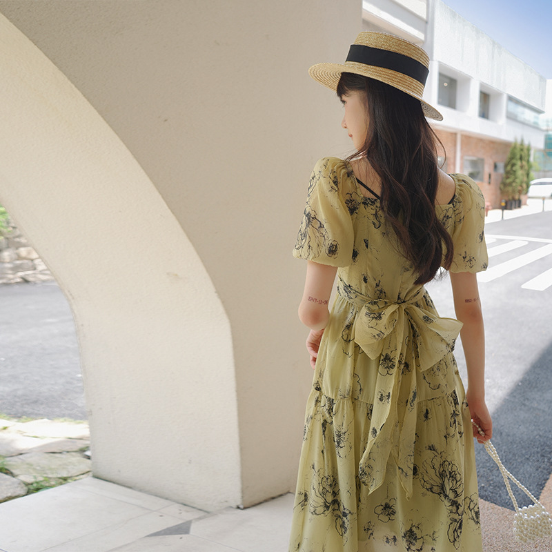 茶歇法式碎花连衣裙女夏甜美显瘦收腰雪纺a字裙优雅碎花连衣裙