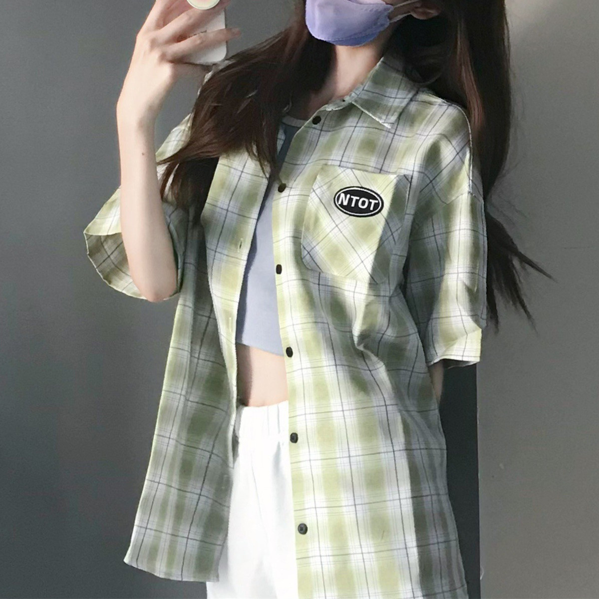 绿色格子短袖衬衫女夏季新款设计感宽松中长款Polo领衬衣外套上衣