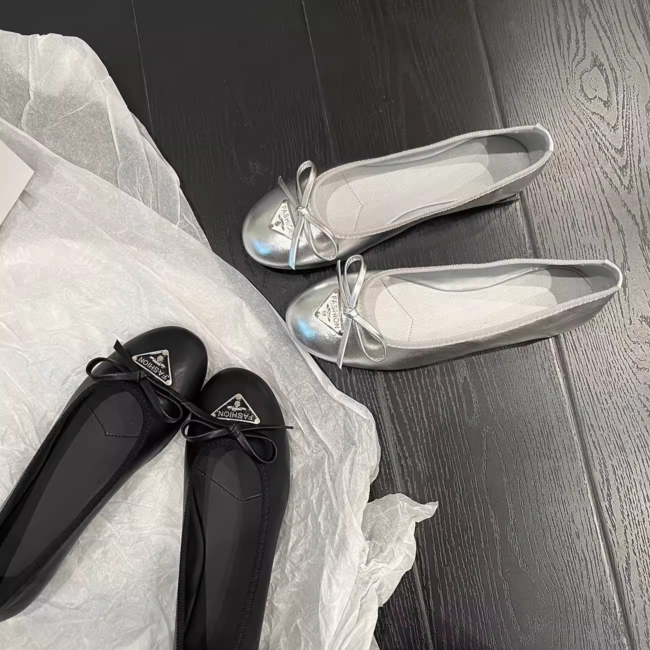 银色圆头三角标平底鞋蝴蝶结浅口一脚蹬芭蕾鞋单鞋女