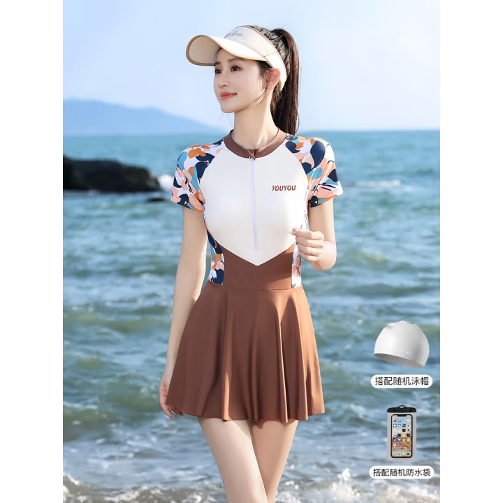 新款裙式分体泳衣V领长袖防晒罩衫遮肚修身显瘦泳衣女高级感泳衣