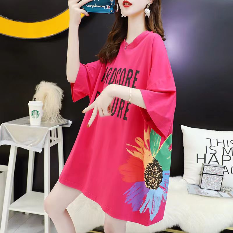 玫粉色短袖半袖欧货t恤新款外贸中长款大码女装洋气时髦上衣