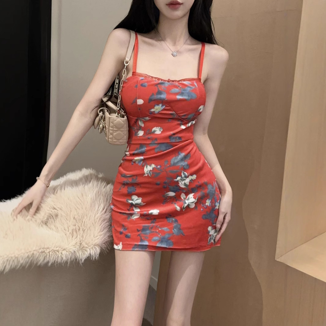 纯欲气质设计感红色印花吊带低胸丝绒紧身包臀四季款性感连衣裙女