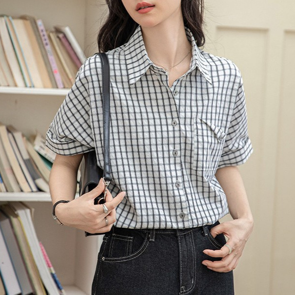 上身显瘦~复古港风格子短袖衬衫女夏季新款翻领小众衬衣上衣