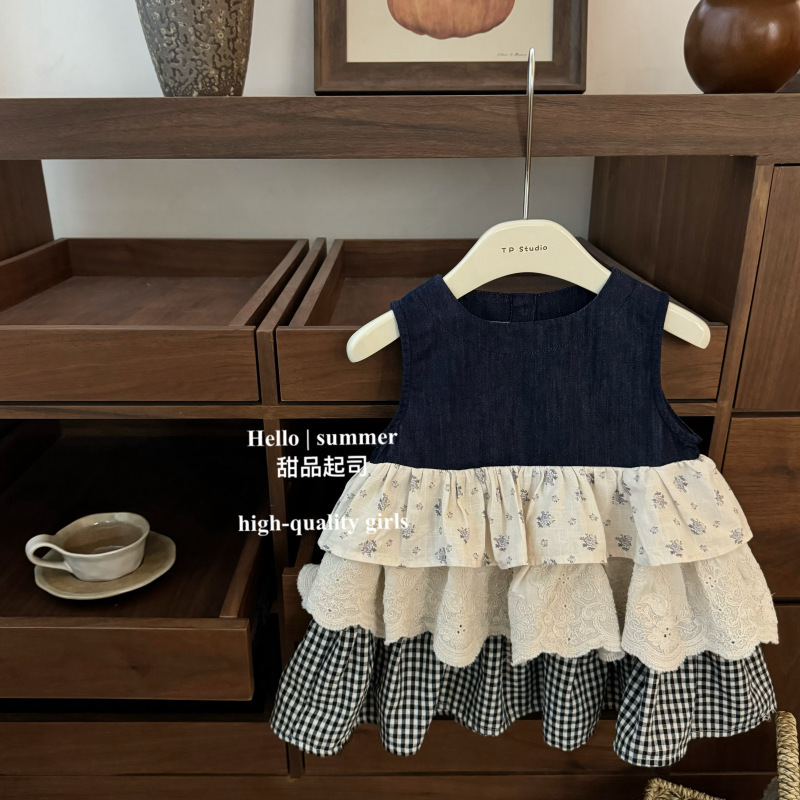 女童背心连衣裙2025夏新款森系儿童无袖公主裙碎花格子拼接蛋糕裙