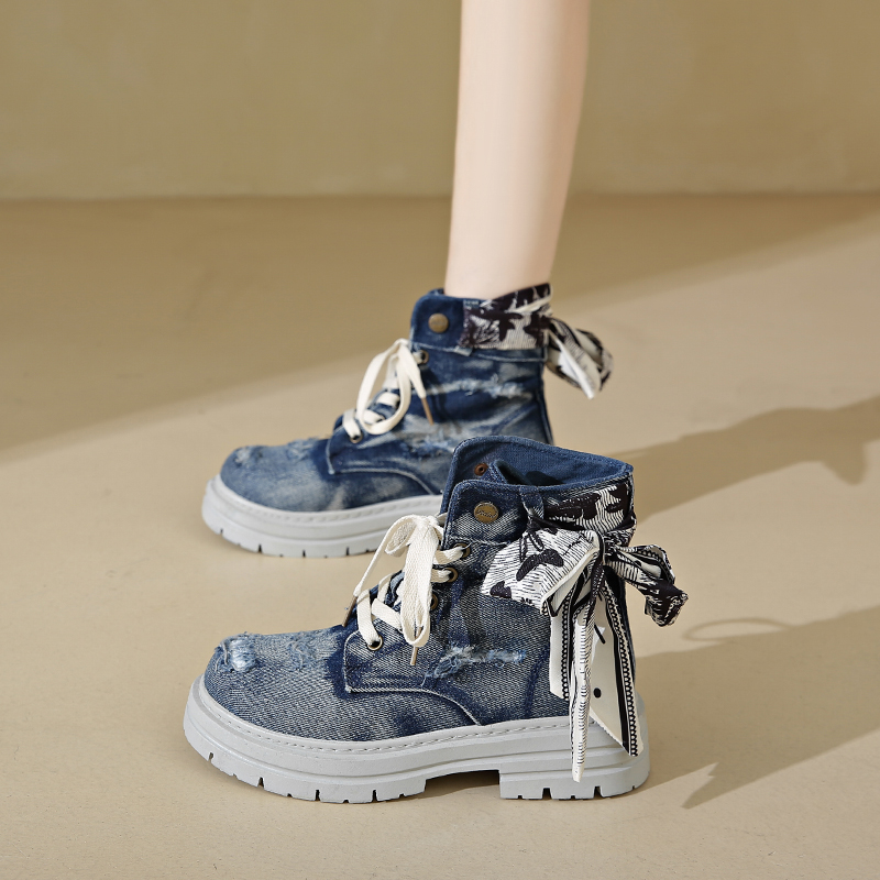 厚底马丁靴女款2025春季新款做旧牛仔布短靴百搭复古英伦风工装靴