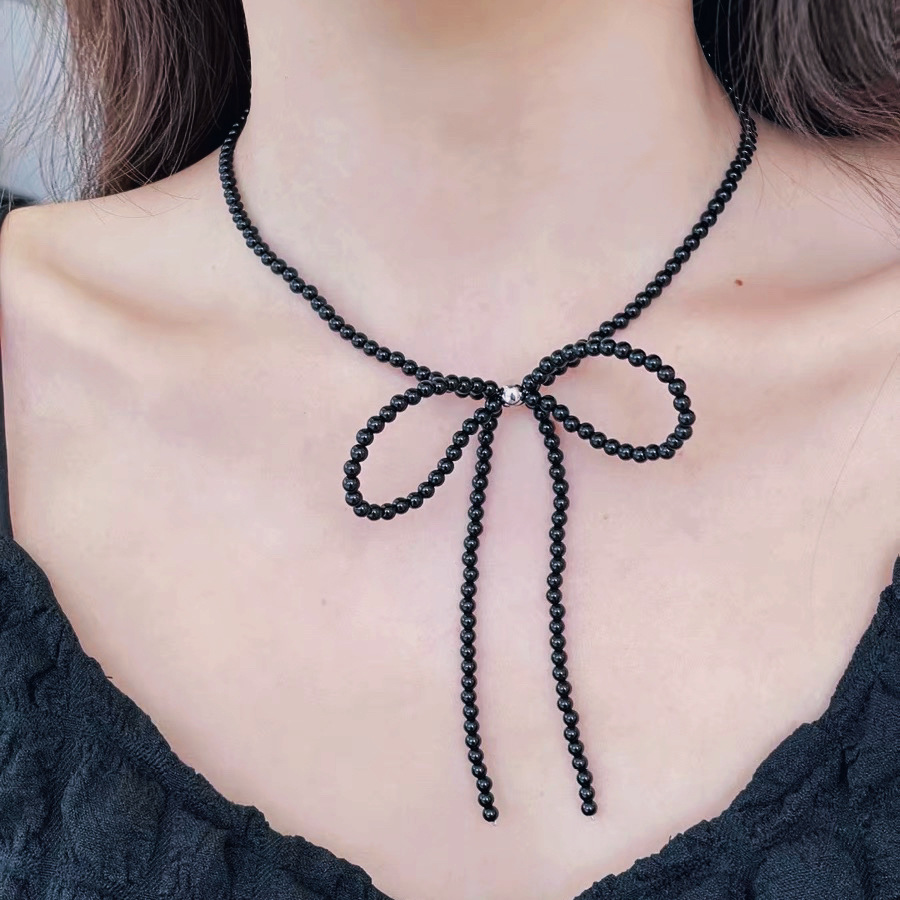 韩国气质甜美黑色串珠长款流苏蝴蝶结珍珠项链少女百搭锁骨链颈链