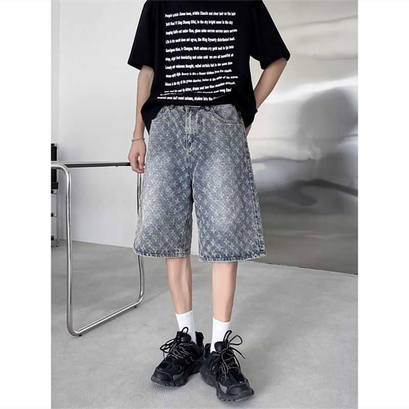 高街vibe风满印提花牛仔短裤男生夏季新款复古宽松直筒阔腿五分裤
