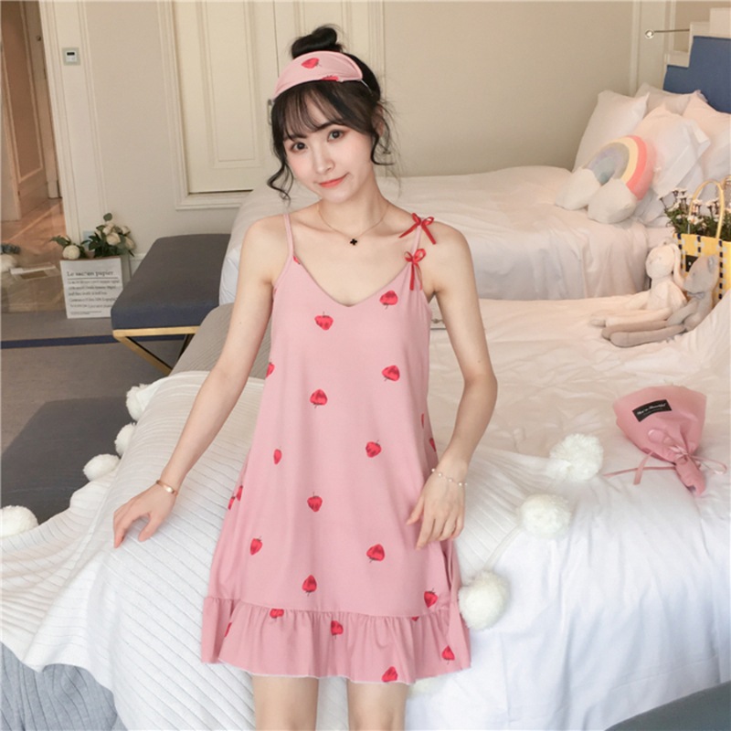 Sexy nightdress性感夏季吊带草莓睡裙女宽松可调节牛奶丝家居服