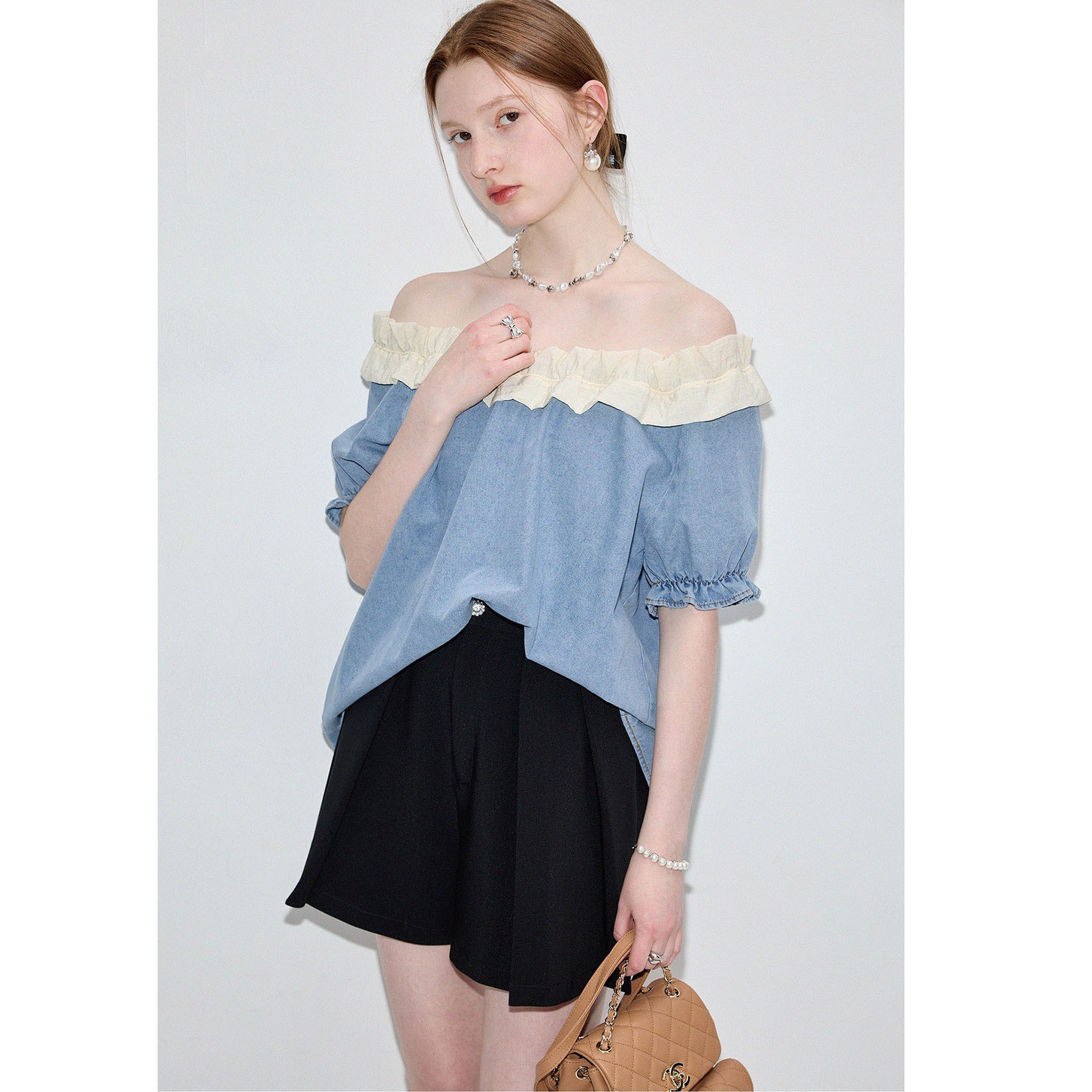 牛仔衬衫女2025年夏新款法式小众宽松荷叶边圆领短袖上衣