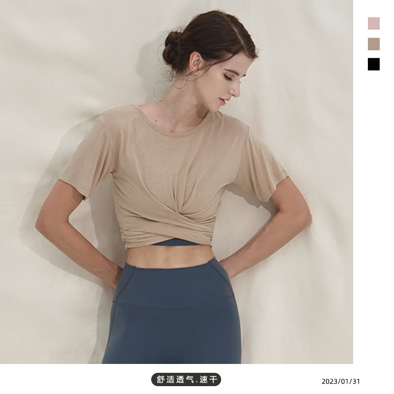 春夏新款交叉褶皱性感V领运动短袖修身显瘦收腰健身瑜伽服舞蹈服