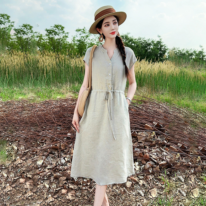夏季系带收腰V领雨露麻连衣裙新款文艺休闲纯色宽松女长裙