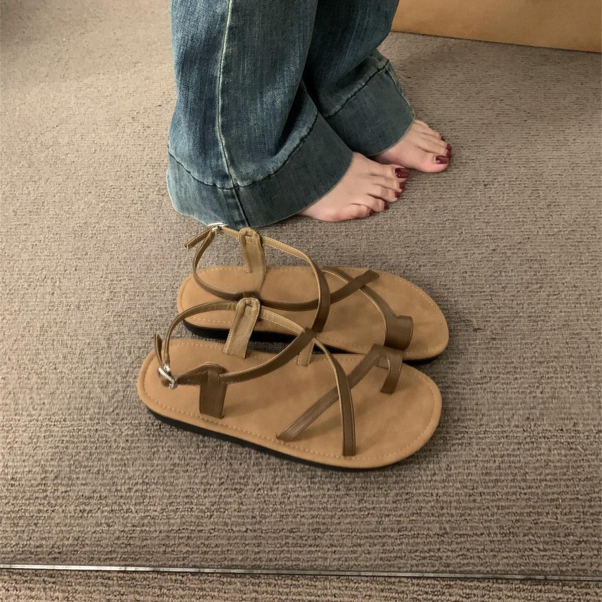 韩版复古风套趾凉鞋女夏季新款休闲一字交叉带平底罗马凉鞋