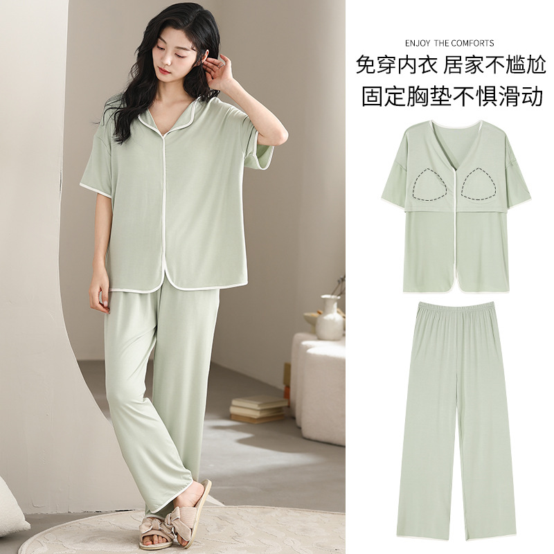 带胸垫睡衣女夏季凉感莫代尔短袖长裤休闲少女士外穿防凸点家居服