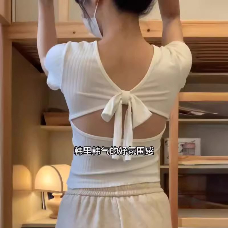 带胸垫镂空辣妹短款上衣 新款修身显瘦夏季蝴蝶结短袖T恤百搭外穿