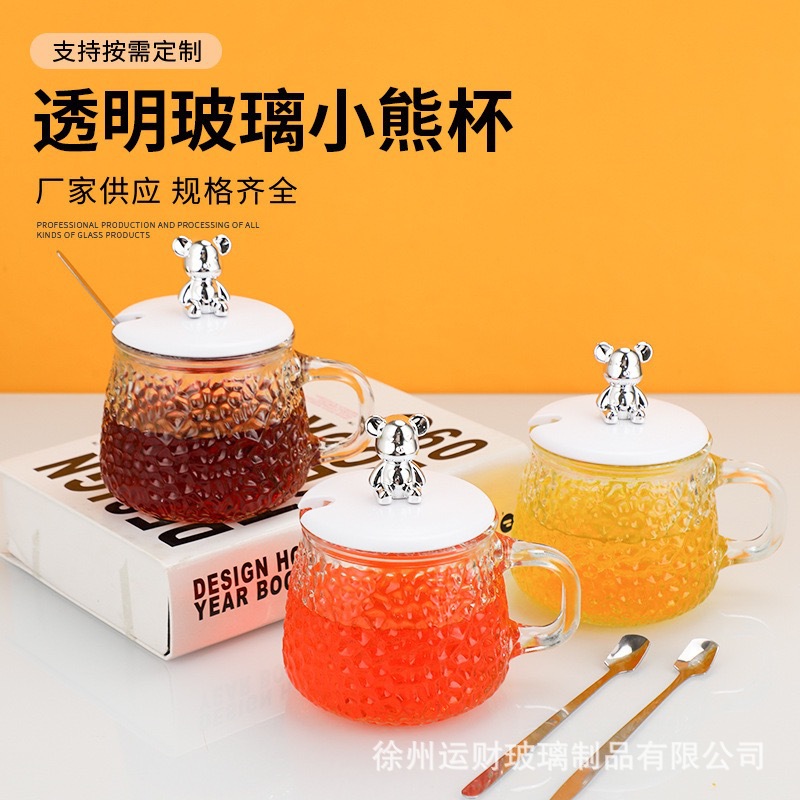 小熊玻璃水杯牛奶杯冰川杯带盖咖啡杯把手杯电镀锤纹马克杯吸管杯