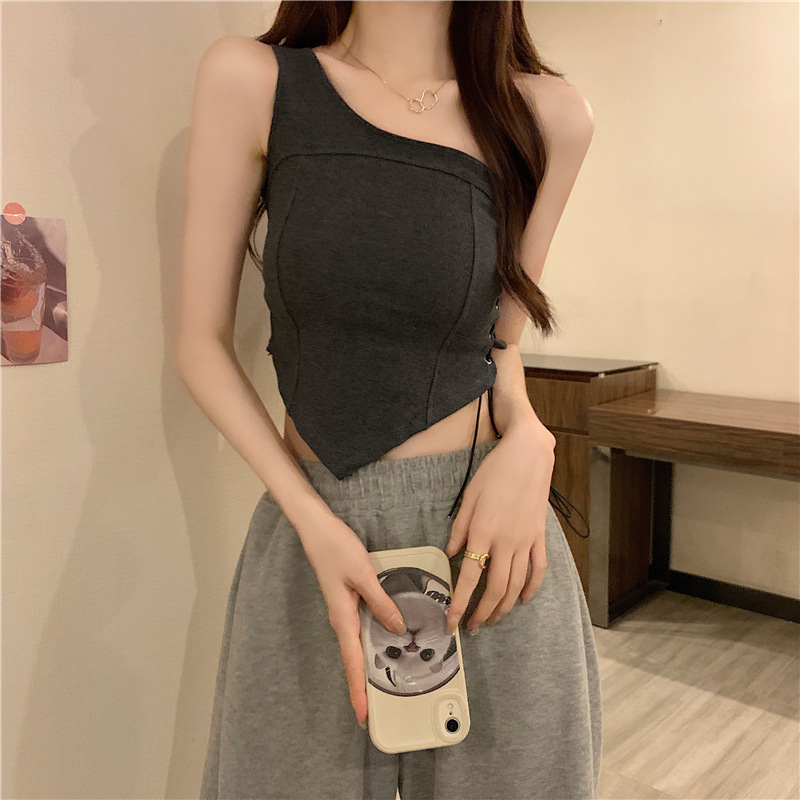 夏季辣妹纯欲风不规则设计感系绳小吊带小心机露背单肩带胸垫上衣