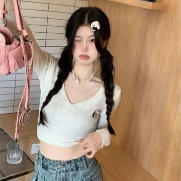 纯棉短款V领长袖t恤女春秋ins潮原宿风chic港味甜辣妹露脐打底衫
