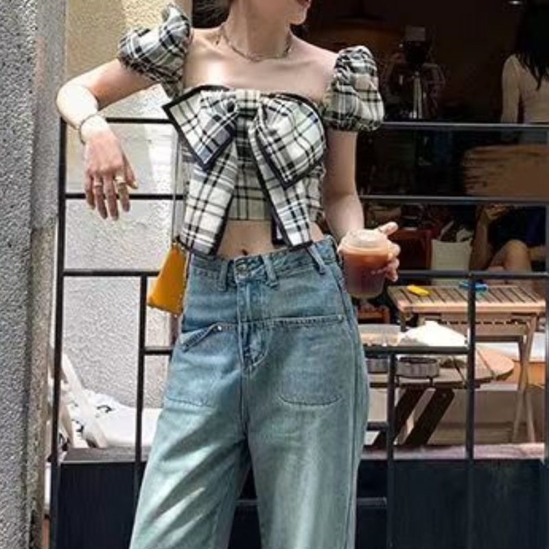 春季 蝴蝶结格子衬衫女新款仙女上衣超仙甜美法式短袖小衫