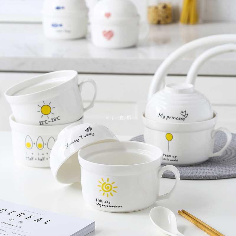 带盖碗饭盒上班族泡面碗带手柄陶瓷汤碗学生宿舍瓷碗方便面碗